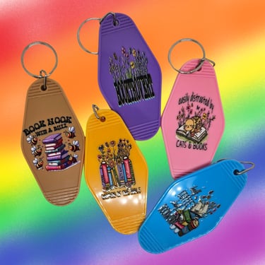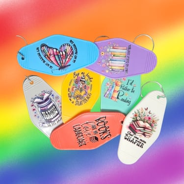 Included in all boxes. Want something a little more retro? Have one of these unique hotel style keychains. You're sure to get people talking when they see it. They come with something on them about books and reading, and they're sure to give you something to hold onto your keys with!