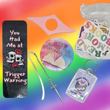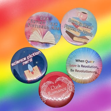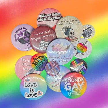Included in all boxes. Are you a button collector? These are unique and fun buttons of different sizes. Buttons will be reader themed unless you've purchased a pride box, where there will be pride buttons as well. Get yourself something unique and hand made!