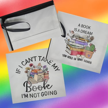 Just the right size to hold a book in the zippered pouch, these also have a pocket in the front where you can put something like a notepad to make notes about your favorite parts! Enjoy the portability it gives, as well as a way to keep that smut secret from everyoned along your path. Eight and a half wide by eleven and three quarters high.
